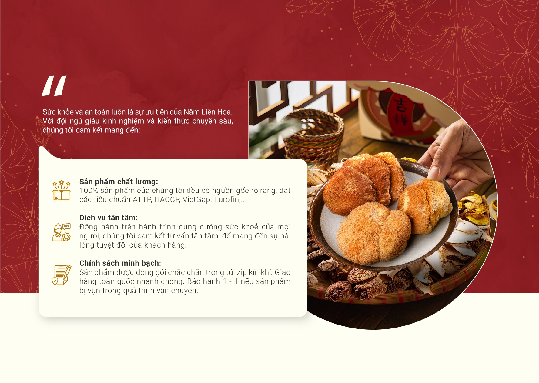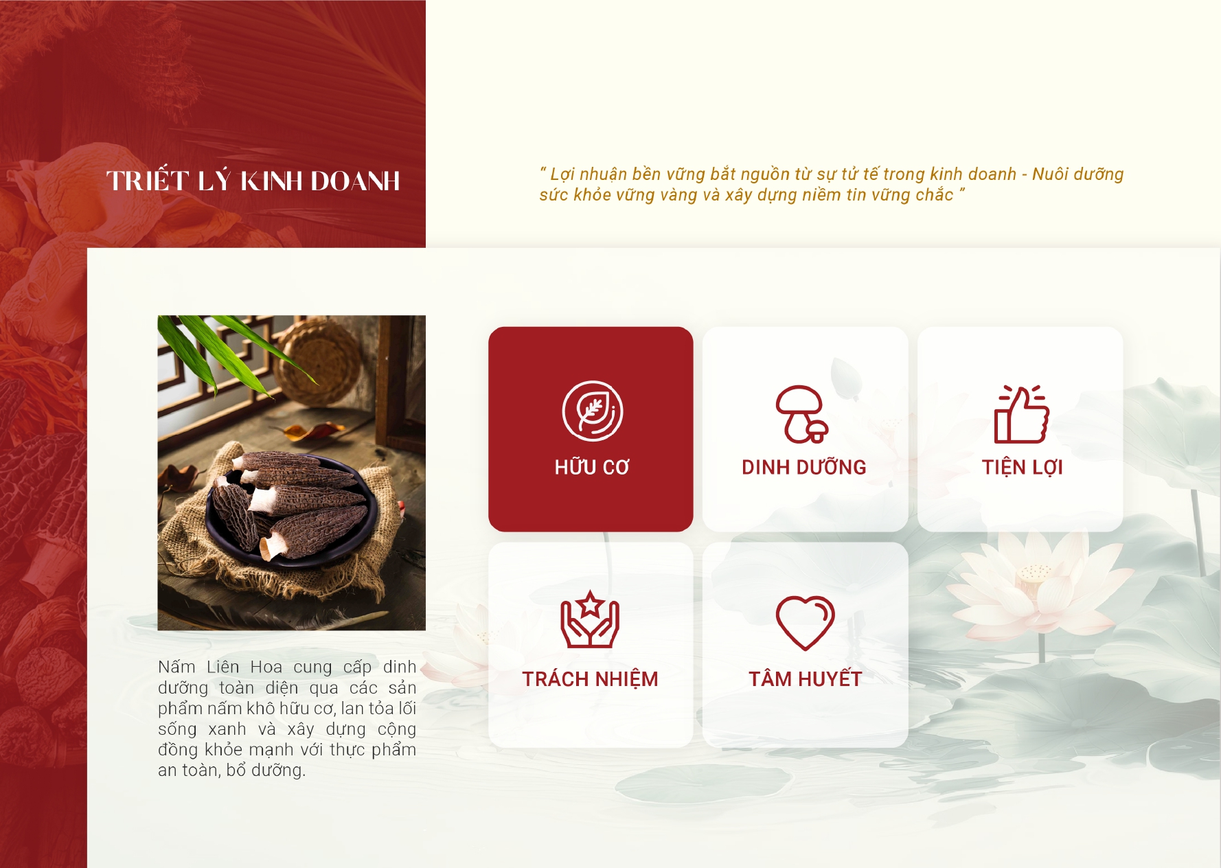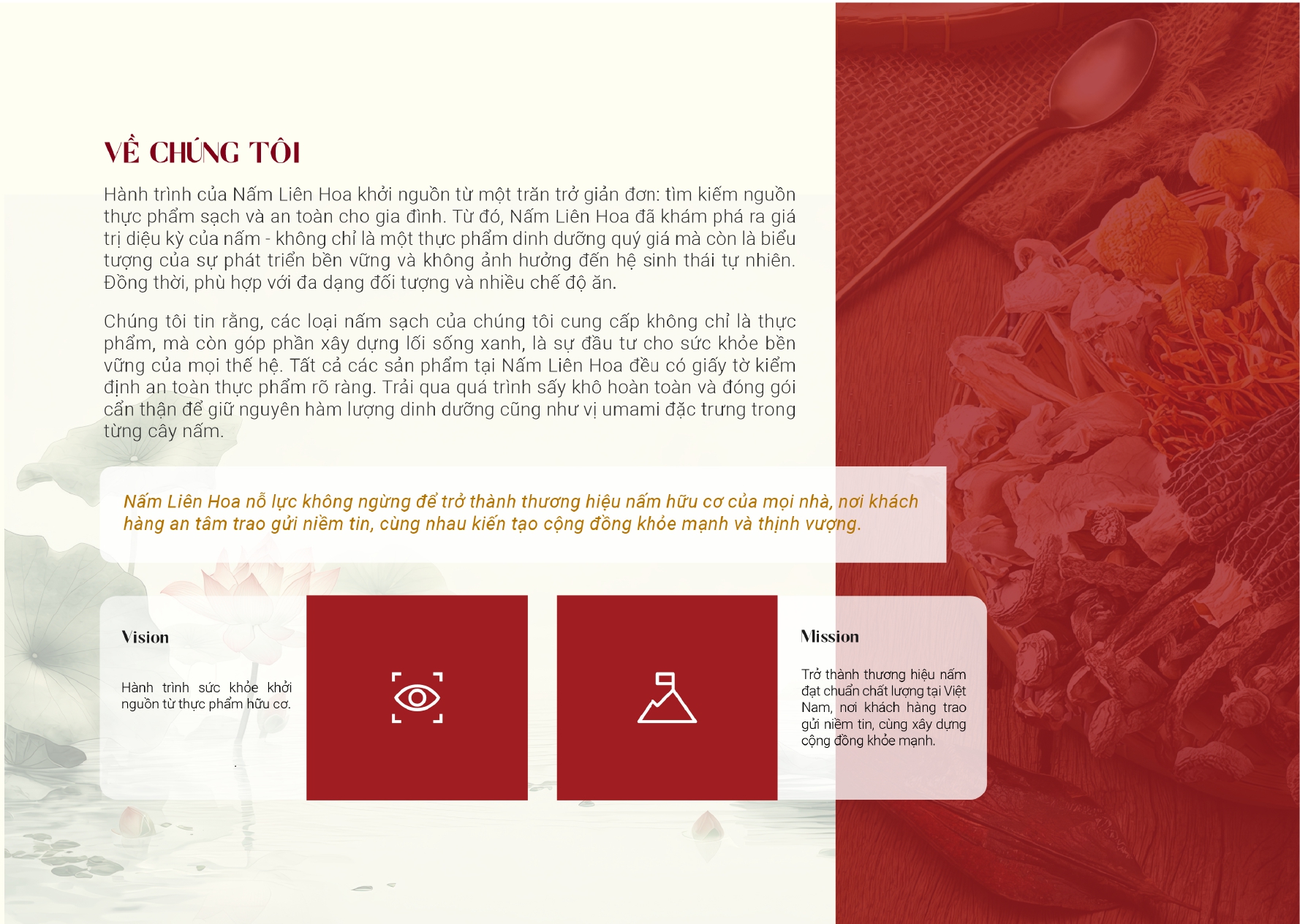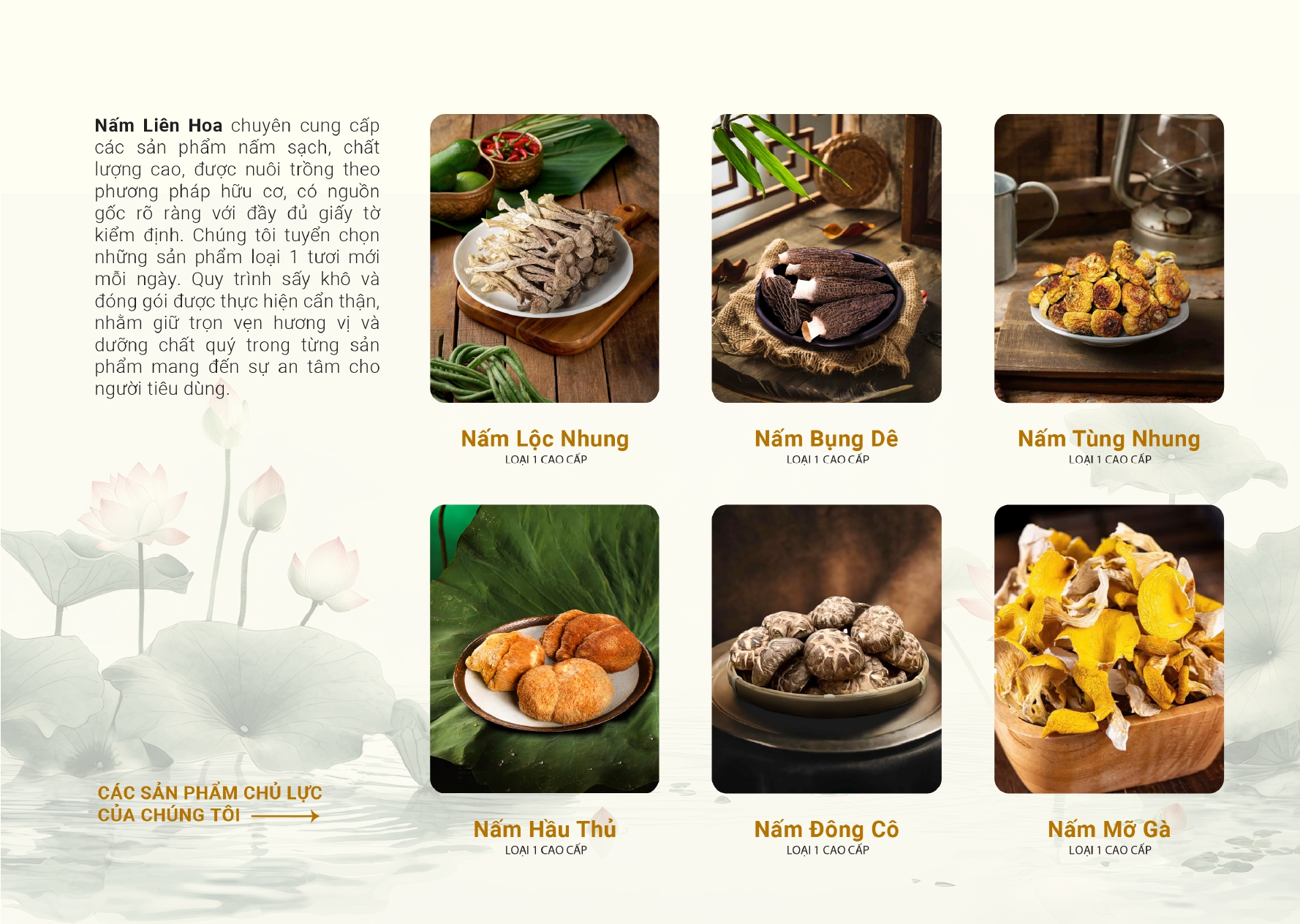 Nấm Liên Hoa ra đời mang đến nguồn dinh dưỡng toàn diện thông qua các sản phẩm nấm khô hữu cơ, lan tỏa lối sống xanh và xây dựng một cộng đồng khỏe mạnh, nơi mọi người đều có thể tiếp cận thực phẩm an toàn và bổ dưỡng. Chúng tôi kiên trì theo đuổi đam mê và liên tục tìm kiếm các loại nấm giàu dinh dưỡng, được nuôi trồng theo quy trình khép kín, không sử dụng hóa chất hay chất tăng trưởng. Tất cả các sản phẩm đều có giấy tờ kiểm định an toàn thực phẩm rõ ràng. Trải qua quá trình sấy khô hoàn toàn và đóng gói cẩn thận để giữ nguyên hàm lượng dinh dưỡng cũng như vị umami đặc trưng trong từng cây nấm.