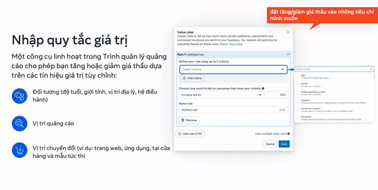 Meta khuyến nghị sử dụng Advantage+ (bạn có thể đọc lại 2.3 để nắm những thông tin trước đó) để phân phối quảng cáo đến nhóm người dùng có hành vi phù hợp với mục tiêu chuyển đổi mềm (nhắn tin, gửi thông tin, để lại yêu cầu đặt lịch). Doanh nghiệp có thể thiết lập theo vị trí địa lý, độ tuổi hoặc đặc điểm đối tượng cơ bản.
