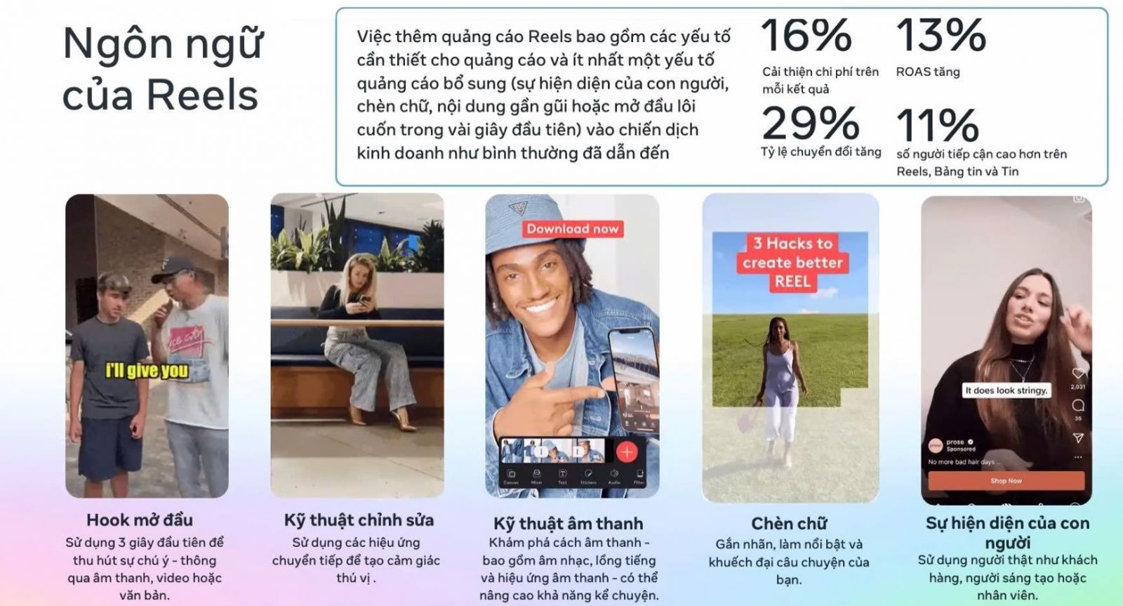 Trên tất cả các sản phẩm và dịch vụ, video ngắn chiến thắng trong việc nâng cao nhận thức. Định dạng ưu tiên cho ngành bán lẻ là video ngắn (dưới 5 phút) > hình ảnh > reels. Còn với ngành làm đẹp, sức khỏe thì ưu tiên video ngắn > reel > hình ảnh. Và bạn cũng cần lưu ý ngôn ngữ của reel như sau: