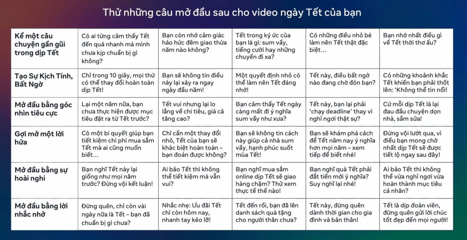 Việc tạo ra nội dung chạm đến cảm xúc và nhu cầu của người dùng là chìa khóa thành công. Meta đã tổng hợp những loại nội dung được người tiêu dùng tìm kiếm nhiều nhất trên Facebook và Instagram trong dịp Tết, đồng thời gợi ý những câu mở đầu 'đắt giá' giúp video của bạn ngay lập tức thu hút sự chú ý và giữ chân người xem từ giây đầu tiên: