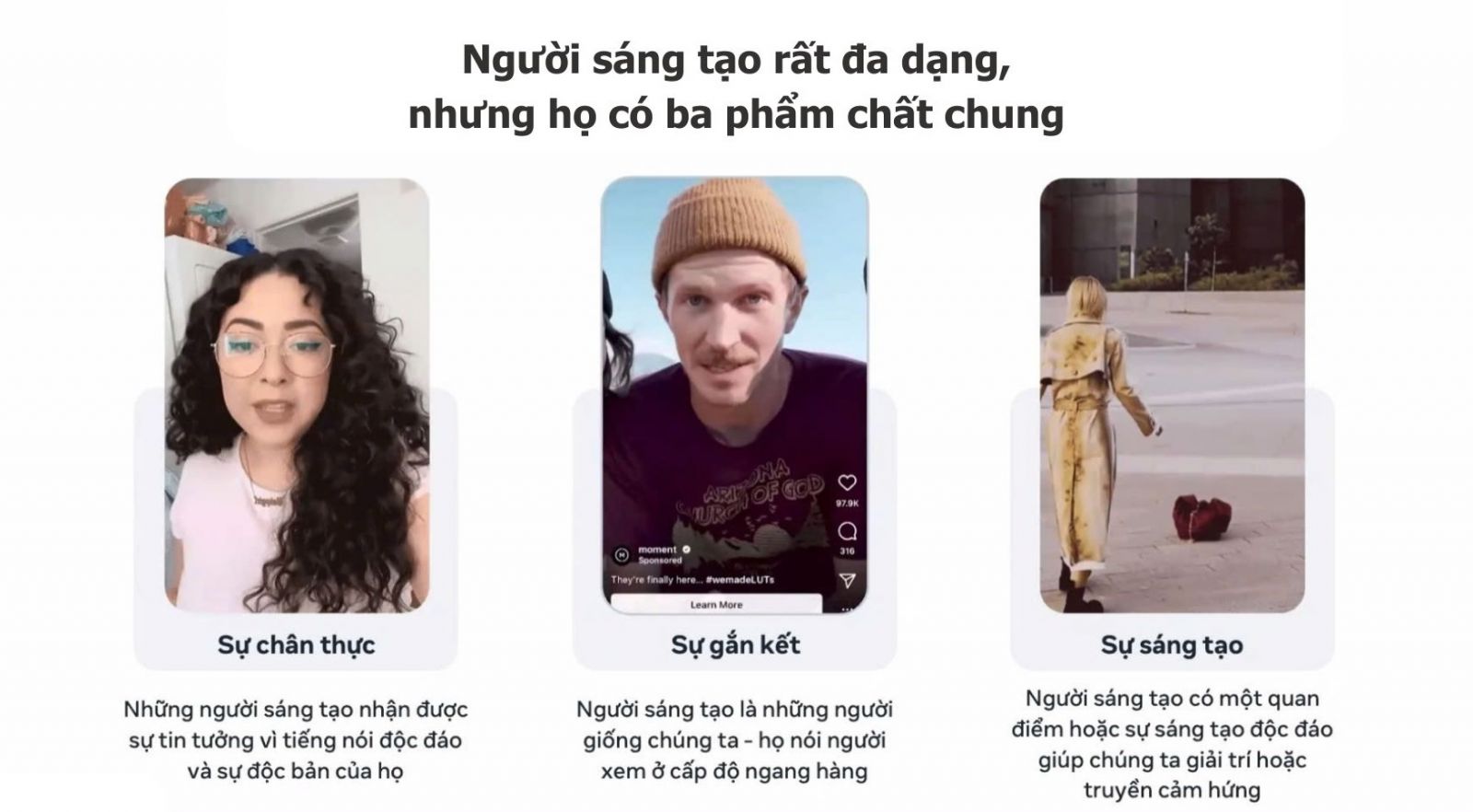 Gần 9 trong số 10 người theo dõi các nhà sáng tạo nội dung và những người nổi tiếng trên mạng, tăng nhẹ so với năm 2024. Điều này cho thấy doanh nghiệp cũng có thể hợp tác với các nhà sáng tạo trên mạng xã hội để tạo hiệu ứng cộng hưởng. Nếu doanh nghiệp còn phân vân không biết nên chọn nhà sáng tạo như thế nào, Meta gợi ý một số tiêu chí sau: