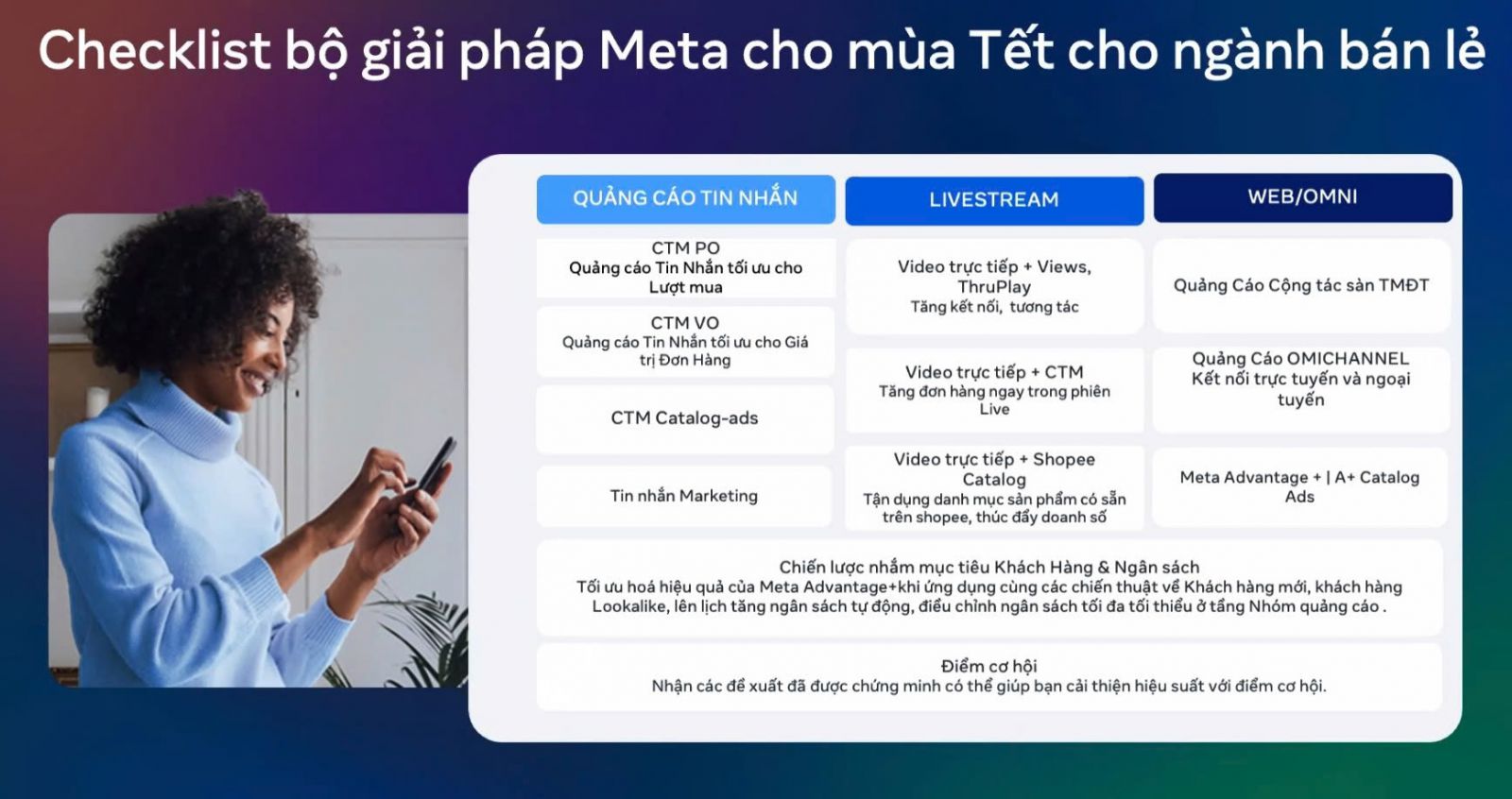 Ngành bán lẻ (FMCG, thời trang, mẹ & bé, nhà cửa, đồ dùng…) luôn là nhóm bùng nổ mạnh nhất trong mùa Tết. Với mức độ cạnh tranh cao và chi phí quảng cáo tăng, Meta khuyến nghị doanh nghiệp nên kết hợp đa mục tiêu quảng cáo thay vì chỉ dùng một mục tiêu duy nhất. Ba nhóm giải pháp trọng tâm gồm: