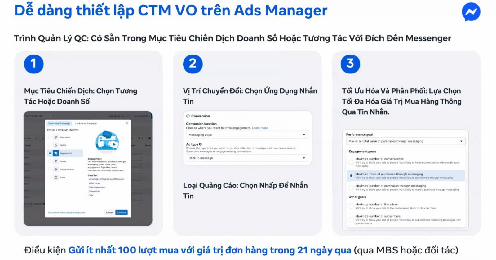 CTM PO (tối ưu lượt mua) và CTM VO (tối ưu giá trị đơn hàng) là hai dạng tối ưu quan trọng nhất cho ngành bán lẻ trong mùa Tết. Cả hai đều yêu cầu doanh nghiệp có tối thiểu 100 lượt mua có giá trị đơn hàng trong 21 ngày gần nhất, từ Meta hoặc đối tác tích hợp dữ liệu. Đây là điều kiện để AI của Meta có đủ tín hiệu học máy và phân phối đến nhóm người dùng có khả năng chốt đơn hoặc mua đơn hàng giá trị cao. Những ngành có giỏ hàng lớn, combo Tết, set quà… sẽ hưởng lợi rõ khi dùng tối ưu giá trị đơn hàng.