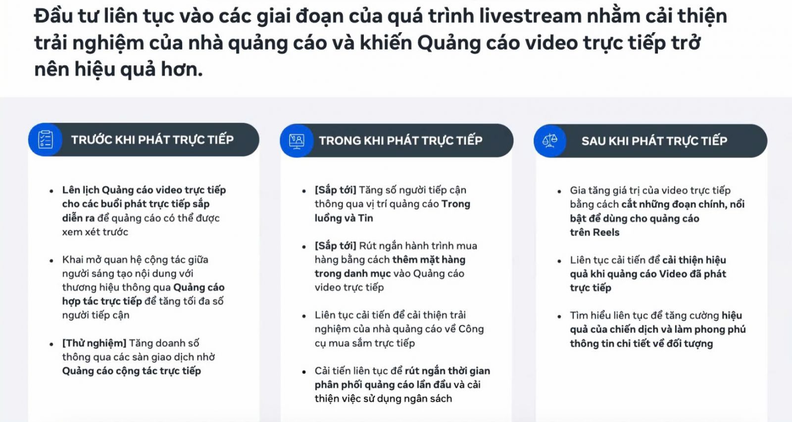 Hiện Meta cung cấp nhiều lựa chọn tối ưu cho quảng cáo video trực tiếp như Video trực tiếp + tương tác/ Video View (thruPlay)/ Website hoặc CTM Ads để tăng lượng người nhắn tin ngay trong buổi phát sóng. Ngoài ra, doanh nghiệp có thể Livestream kết hợp Catalog (tích hợp qua đối tác hoặc sử dụng catalog sẵn có trên Shopee) để hiển thị sản phẩm trực tiếp trong buổi live, giúp người dùng chọn – thêm giỏ – mua nhanh hơn.