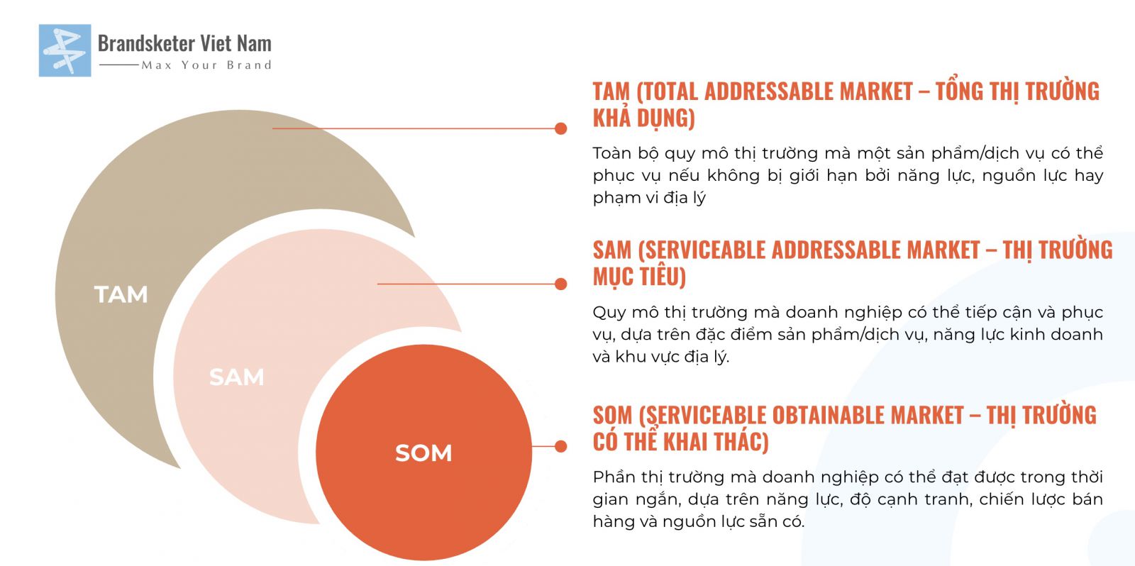 TAM, SAM, SOM giúp doanh nghiệp xác định từ rộng đến hẹp — từ tầm nhìn toàn bộ thị trường có thể phục vụ đến phân khúc khả thi và cuối cùng là miếng thị phần thực tế có thể đạt được. Điều này giúp doanh nghiệp tránh dàn trải nguồn lực và có thể tập trung vào phân khúc có lợi thế cạnh tranh.