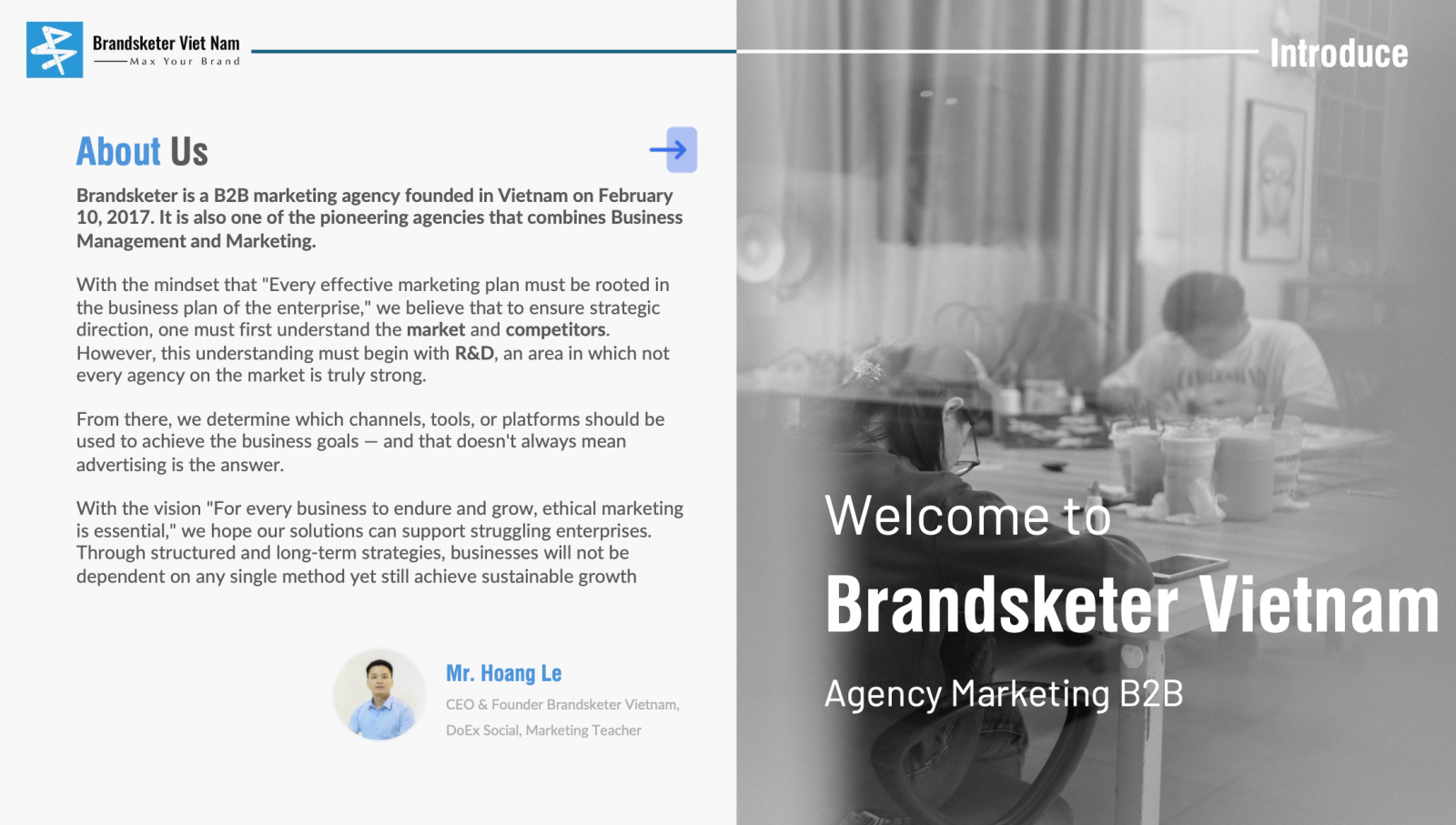 Tôi là Lê Hoàng, người sáng lập Brandsketer Việt Nam, một đơn vị chuyên sâu trong lĩnh vực Quản trị Marketing tổng thể về chiến lược & đào tạo doanh nghiệp. Suốt hơn 10 năm làm nghề, tôi đã trực tiếp tư vấn, xây dựng chiến lược Marketing cho hàng trăm doanh nghiệp vừa và nhỏ (SMEs) tại Việt Nam, từ các lĩnh vực dịch vụ, bán lẻ, sản xuất cho đến công nghệ.